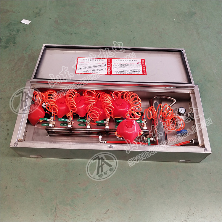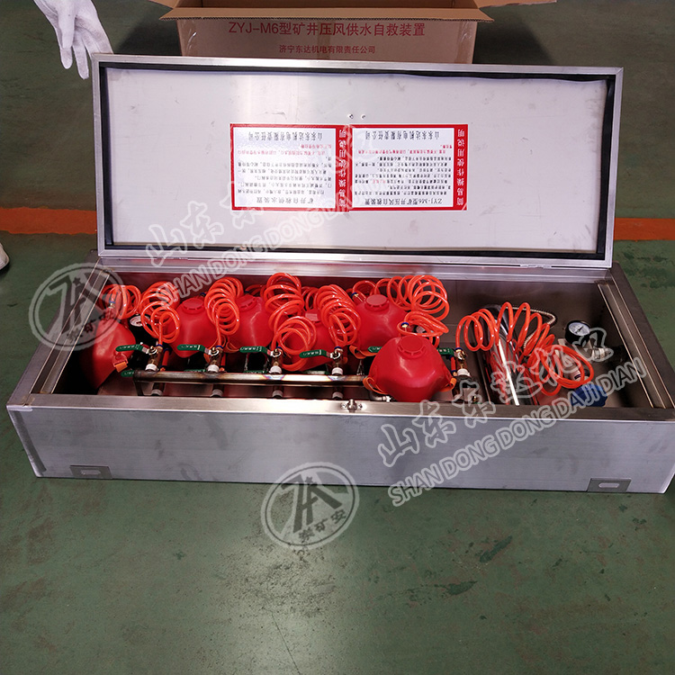 ZYJ(A)型矿井压风自救装置是一种新型的隔绝式气体呼吸防护装置,本装置一箱六组,能同时提供六人使用,达到互相照顾的效果。